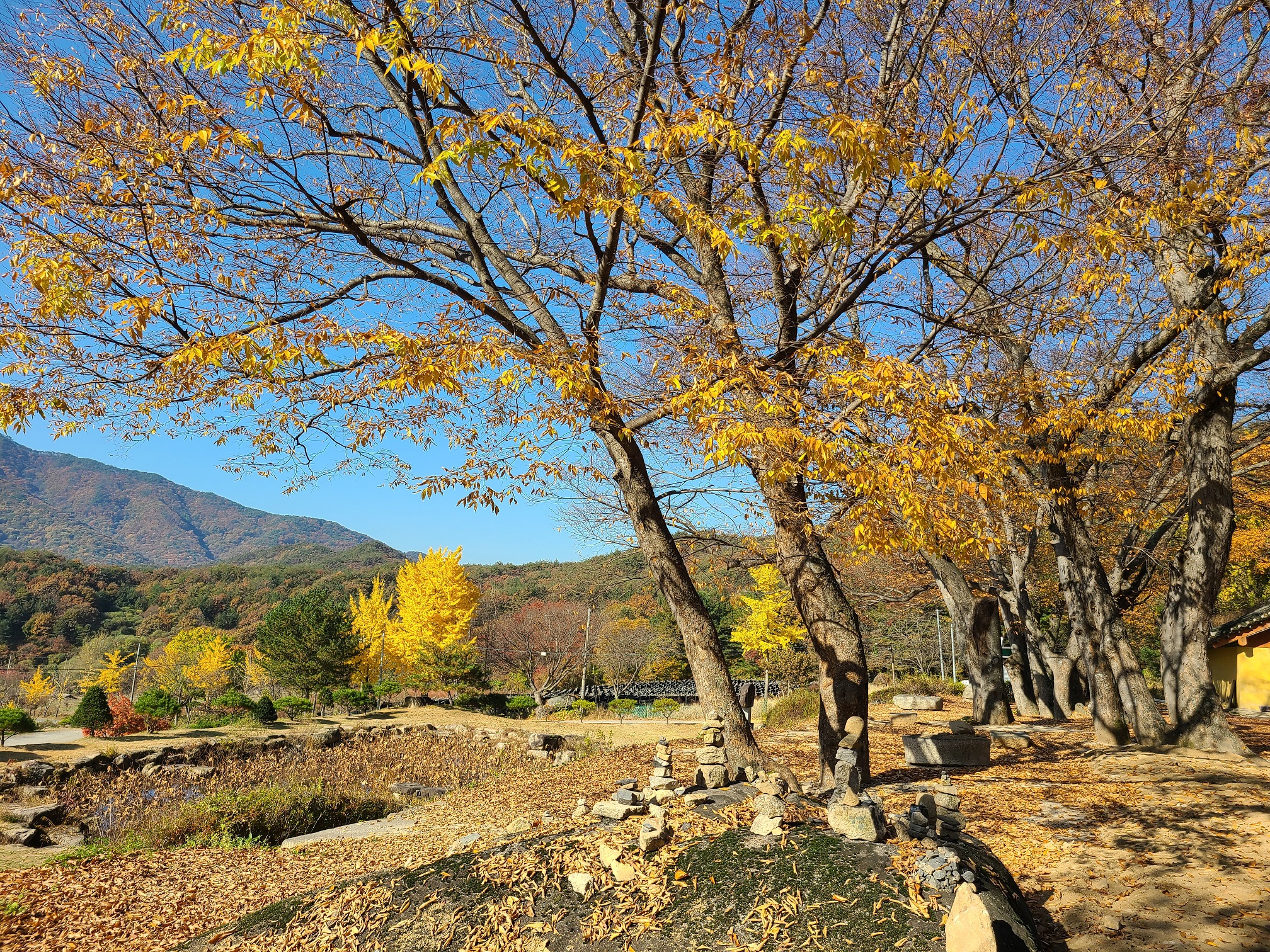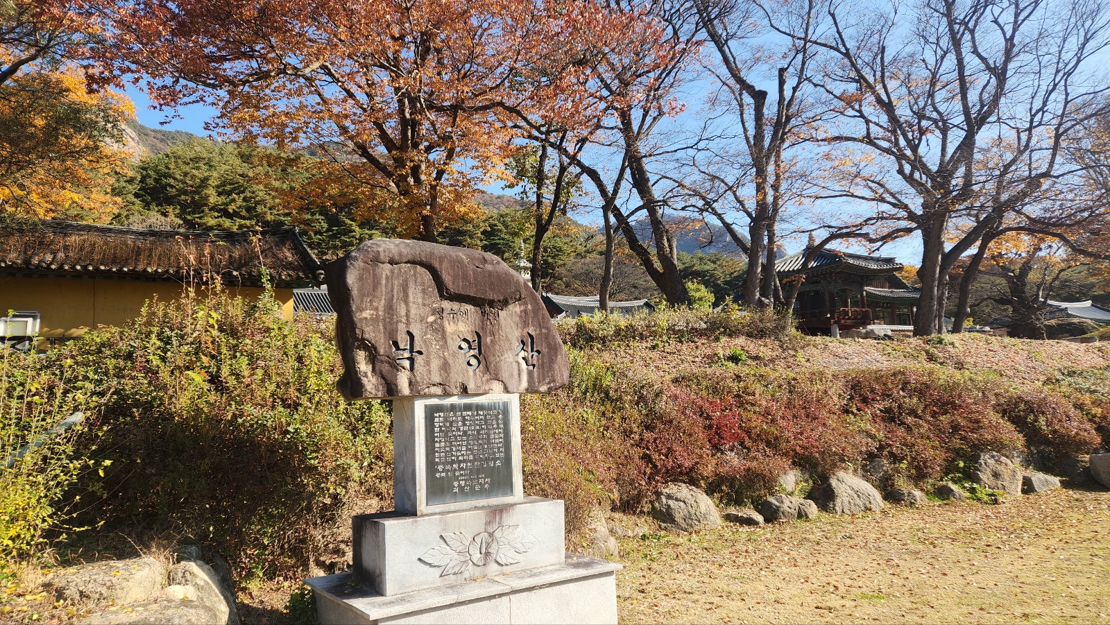 늦어진 가을에 모임에 참석 했다가 예정에 없이 아침 산책 삼아 다녀 왔던 곳인데 돌아 온 후 정신없이 지낸터라 잊고 있다가 사진을 보았네요... 그냥 묻혀있다 없어지면 아쉬우니 늦었지만 정리 해봅니다. 절 앞의 탁트인 넒은 지형과 오래된 느티나무들이 어우러진 풍경이 낙영산을 뒷배경 삼아 아름다운곳이었습니다. 너른 공터들이 계속 다듬어져 정리 되어 가고 있어 보입니다. 또 가 볼 기회가 있을지 모르겠지만 잘 단장되어 많이 바뀌어 있을것 같은 예감이 듭니다.