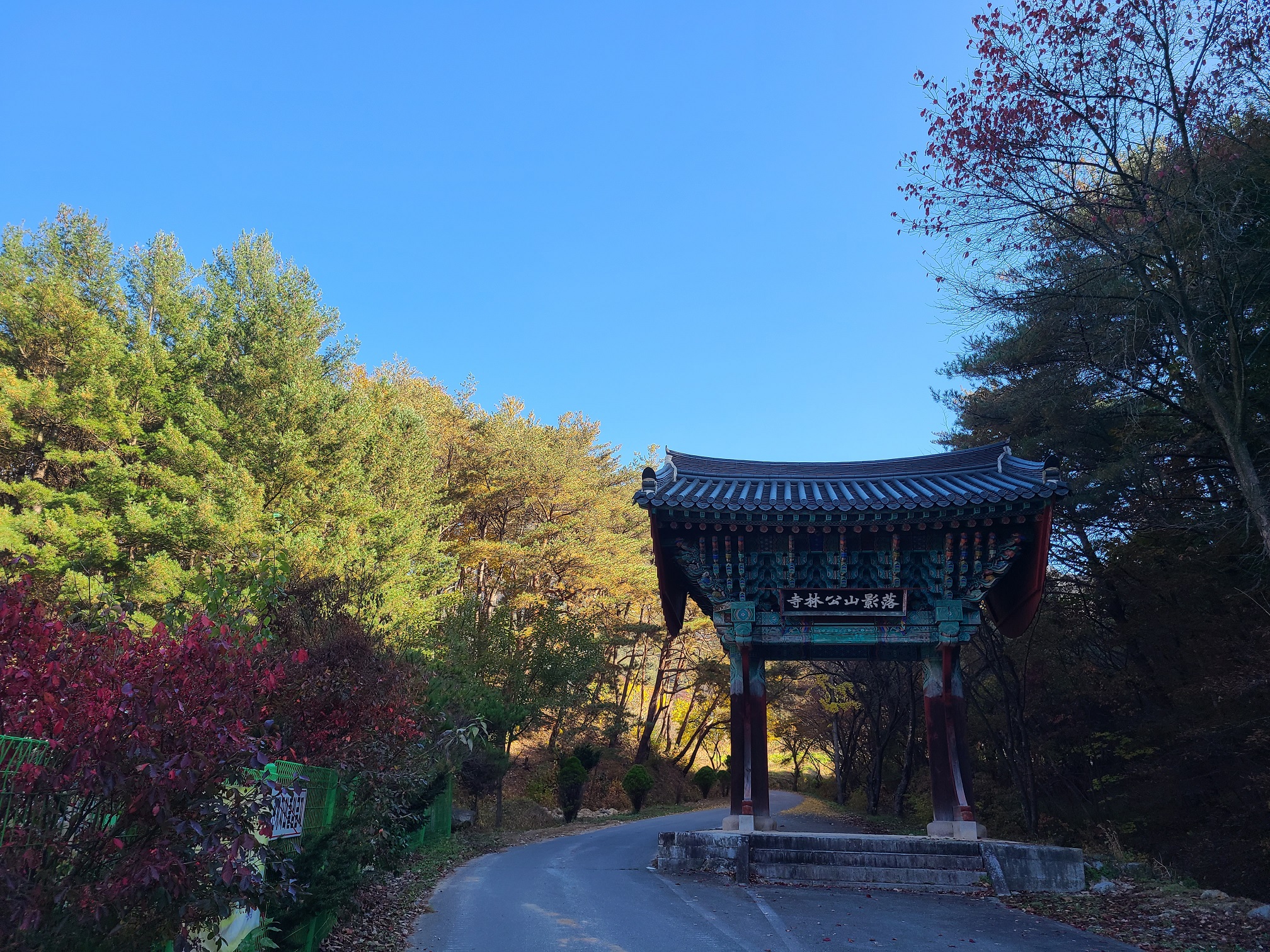 적광탑과 대웅전이 건축학적으로 잘 조화를 이루고 있다. 범종루 옆의 계단을 통해 주차장으로 향한다. 주차장에서 낙영산을 배경으로 위치한 공림사를 바라보니 울창한 느티나무에 꼭꼭 숨어 있다.